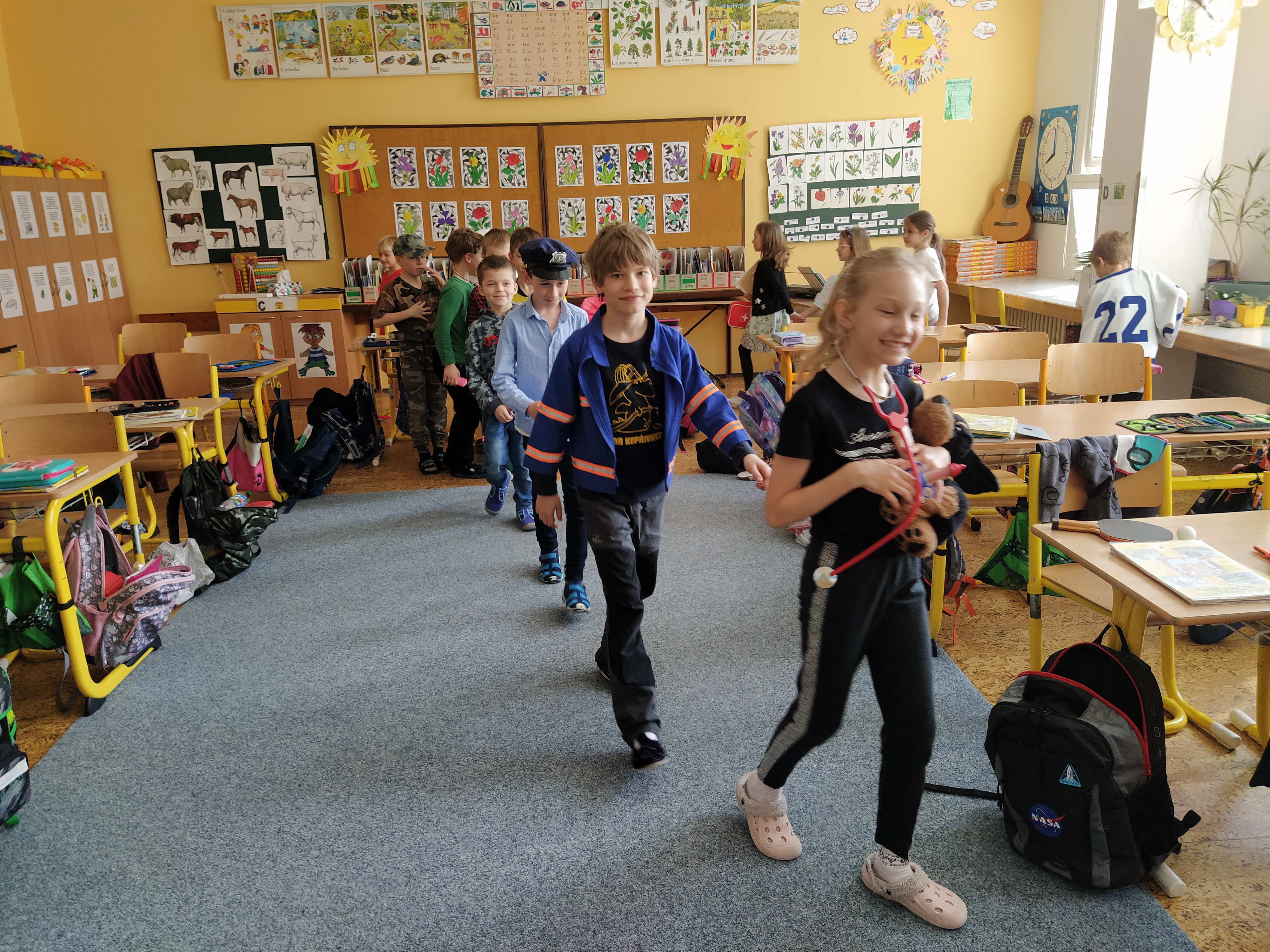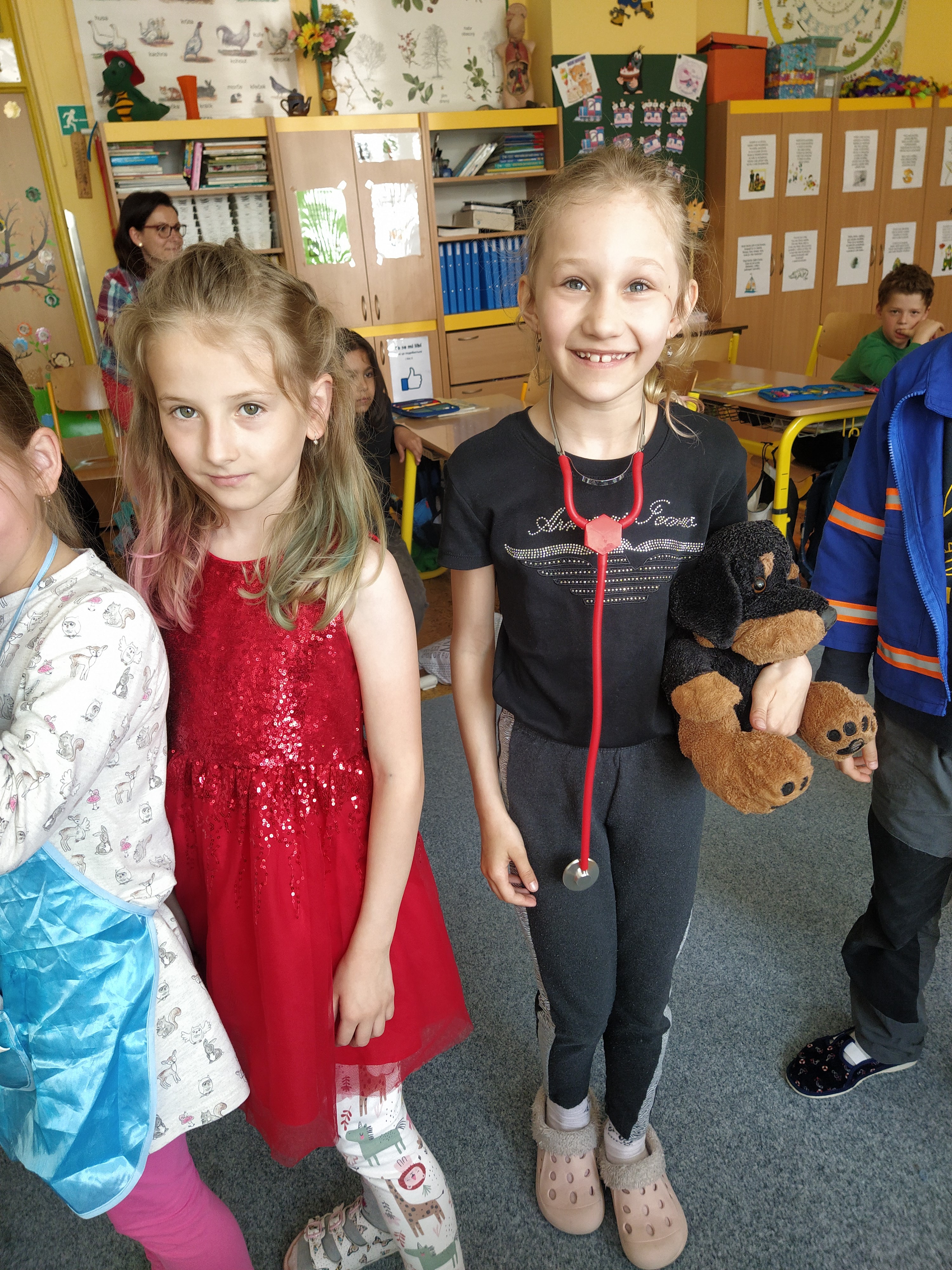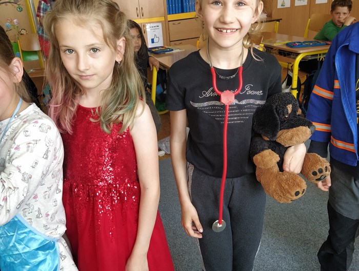 V prvouce jsme si povídali o povolání dospělých – děti nám předvedly různé profese – lékař, zdravotní sestra, fotbalista, kadeřnice, zvěrolékařka, hokejista, opravář, policista, hasič…..