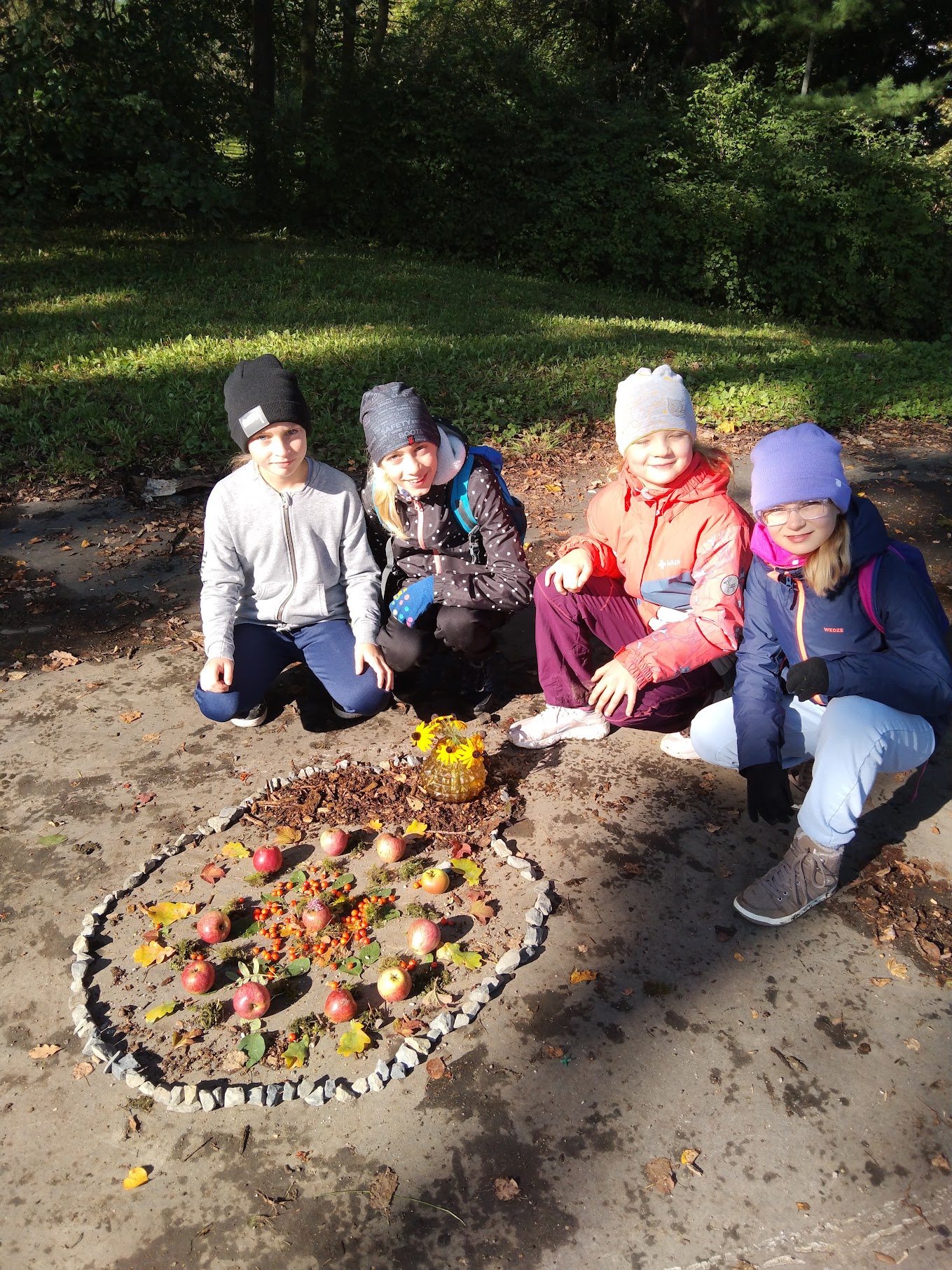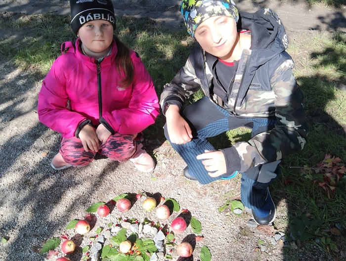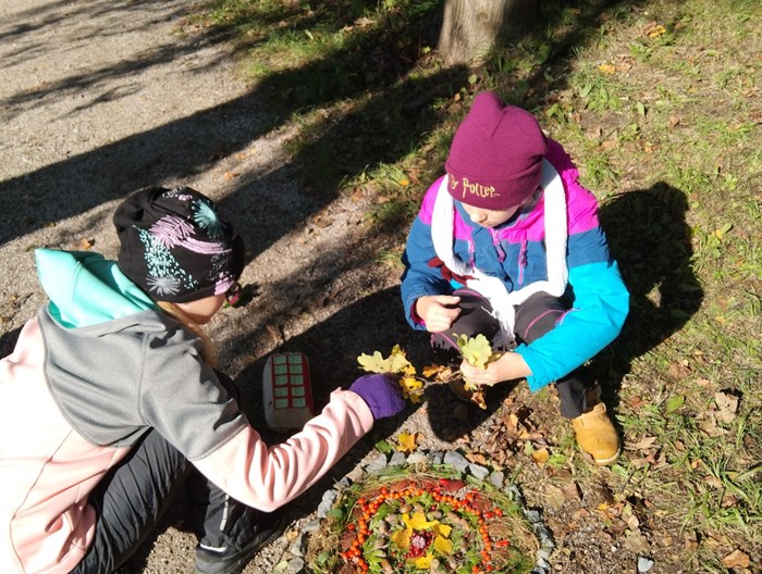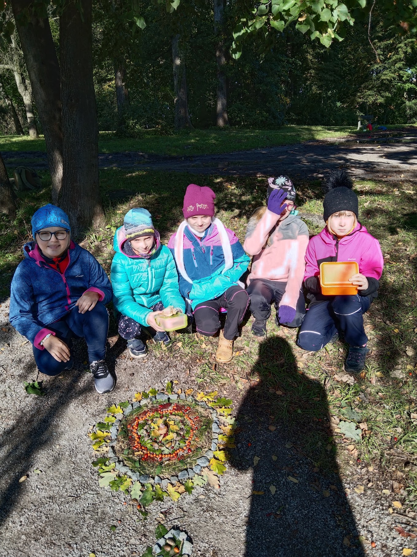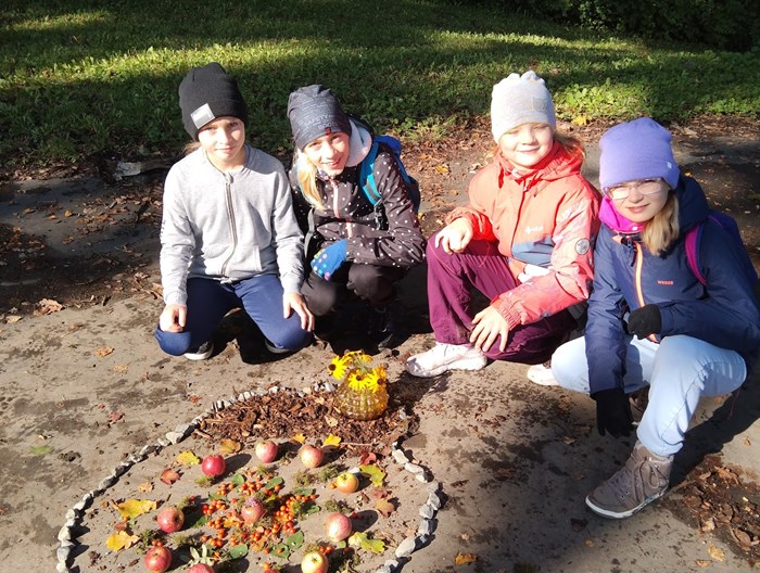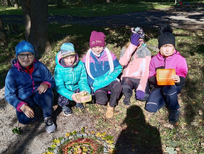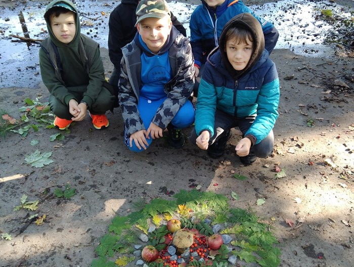 Zde měli žáci možnost vyzkoušet si výtvarně tvořit venku a dle vlastní fantazie splnit zadaný úkol – poskládat siv čase podzimním z přírodnin vlastní mandalu.Ke své práci využili kaštany, žaludy, šípky, oříšky, listy, klacíky, šišky, kůry a další plody.Žáci pracovali ve skupinách a myslím, že se jim práce povedla. Hlavním cílem bylo vyzkoušet si a prožít si něco novéhomimo prostory klasické třídy a načerpat pozitivní energii z přírody kolem nás.
