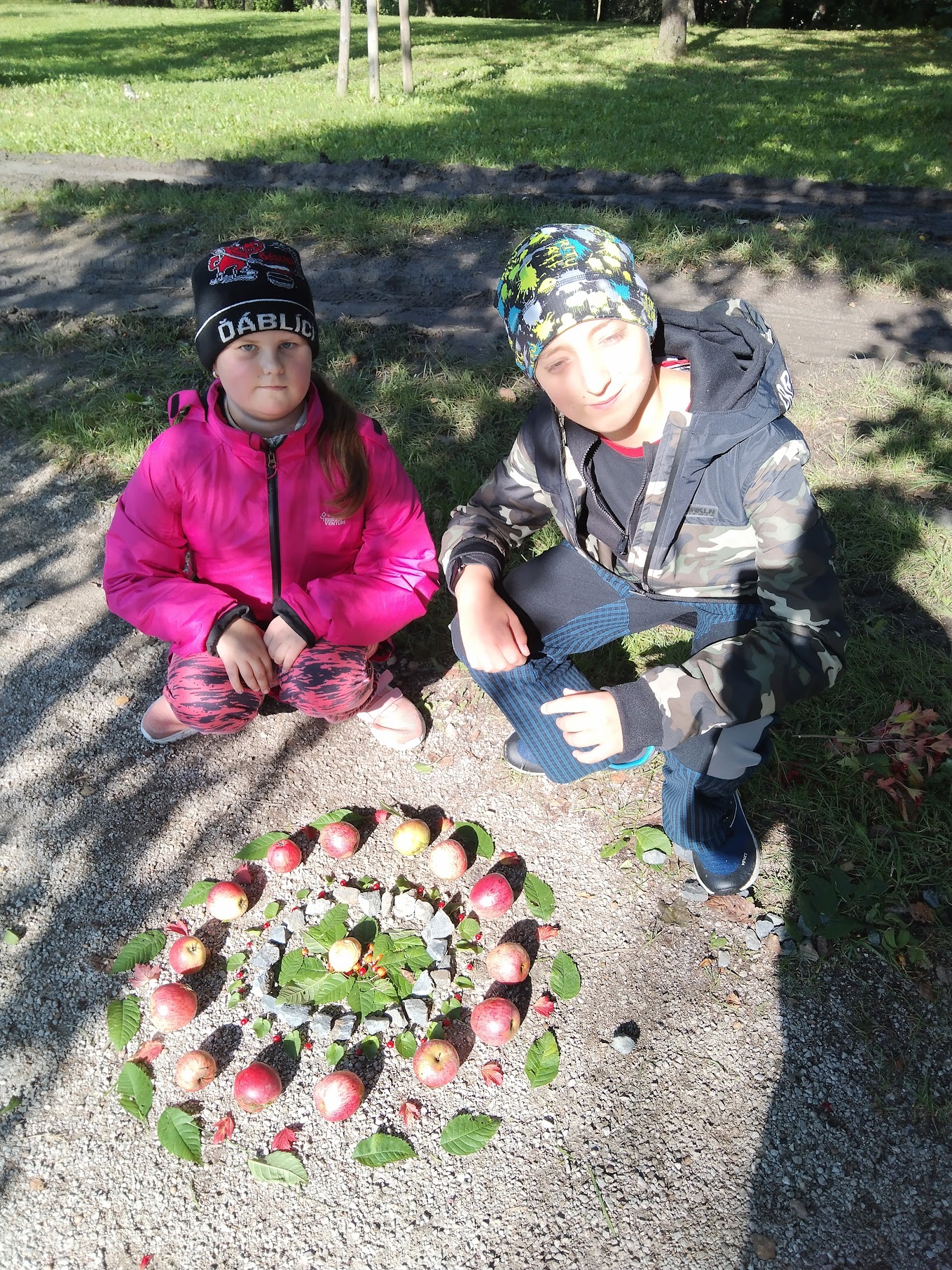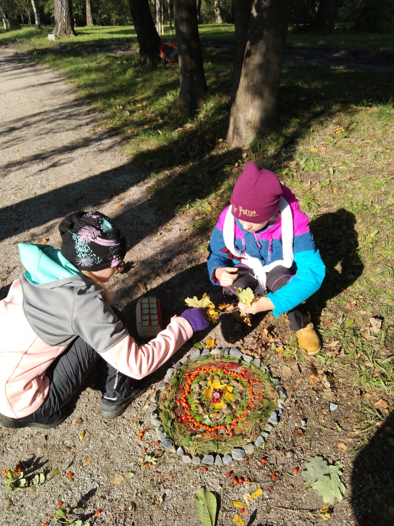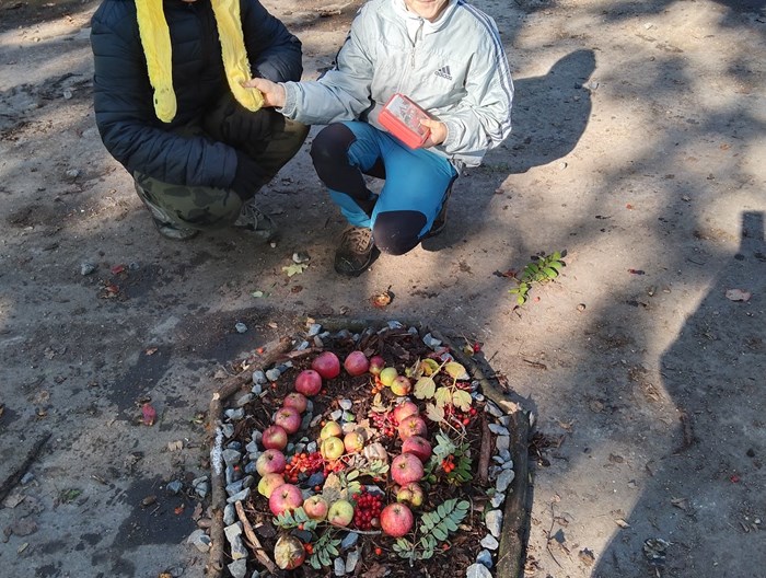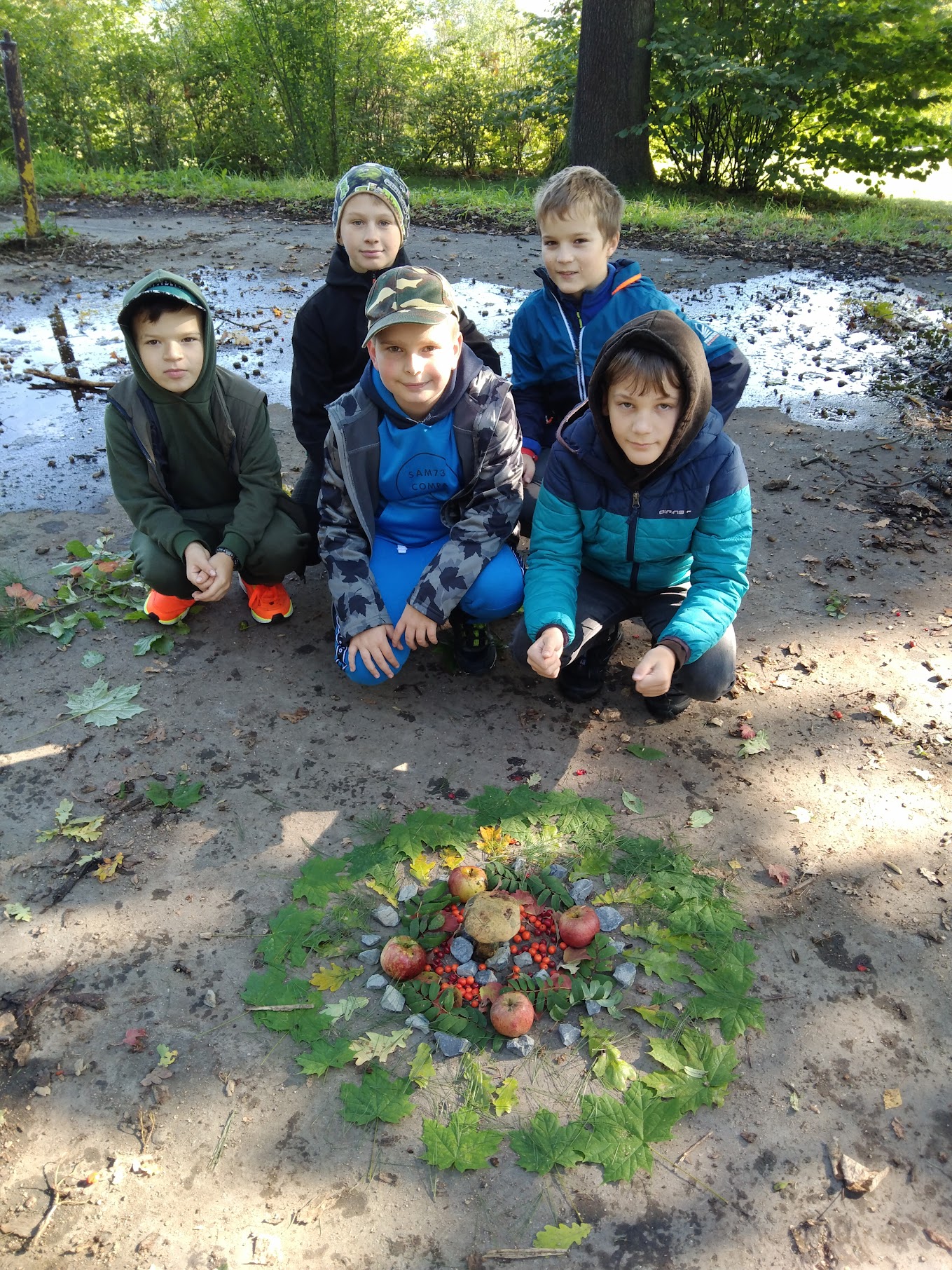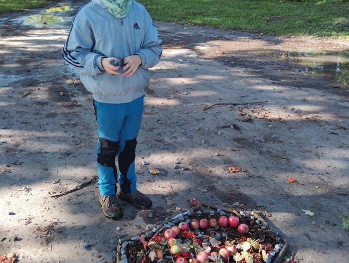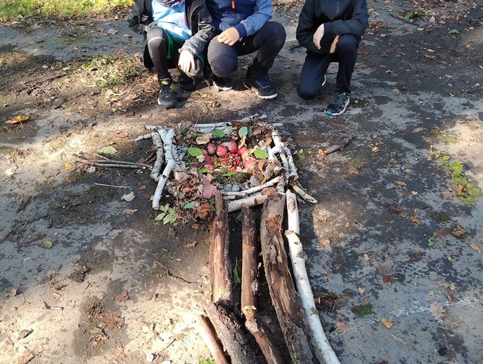 Zde měli žáci možnost vyzkoušet si výtvarně tvořit venku a dle vlastní fantazie splnit zadaný úkol – poskládat siv čase podzimním z přírodnin vlastní mandalu.Ke své práci využili kaštany, žaludy, šípky, oříšky, listy, klacíky, šišky, kůry a další plody.Žáci pracovali ve skupinách a myslím, že se jim práce povedla. Hlavním cílem bylo vyzkoušet si a prožít si něco novéhomimo prostory klasické třídy a načerpat pozitivní energii z přírody kolem nás.