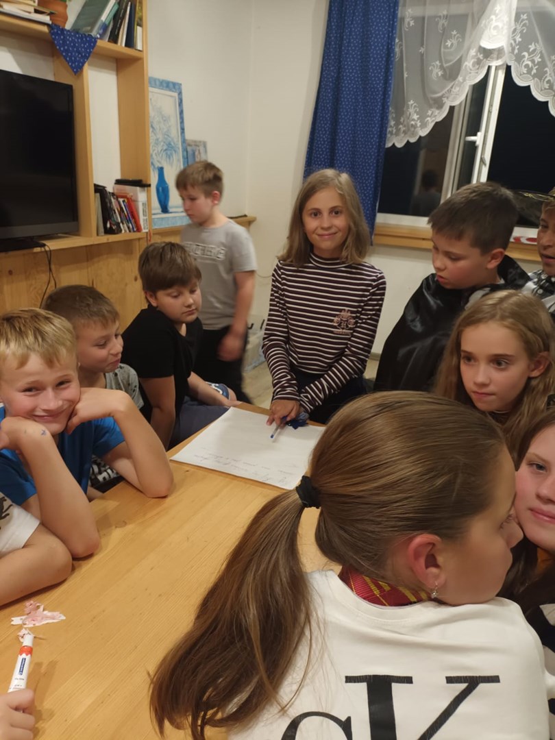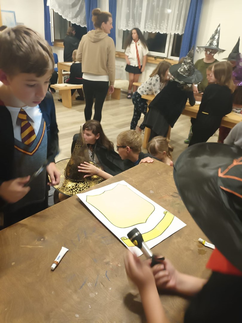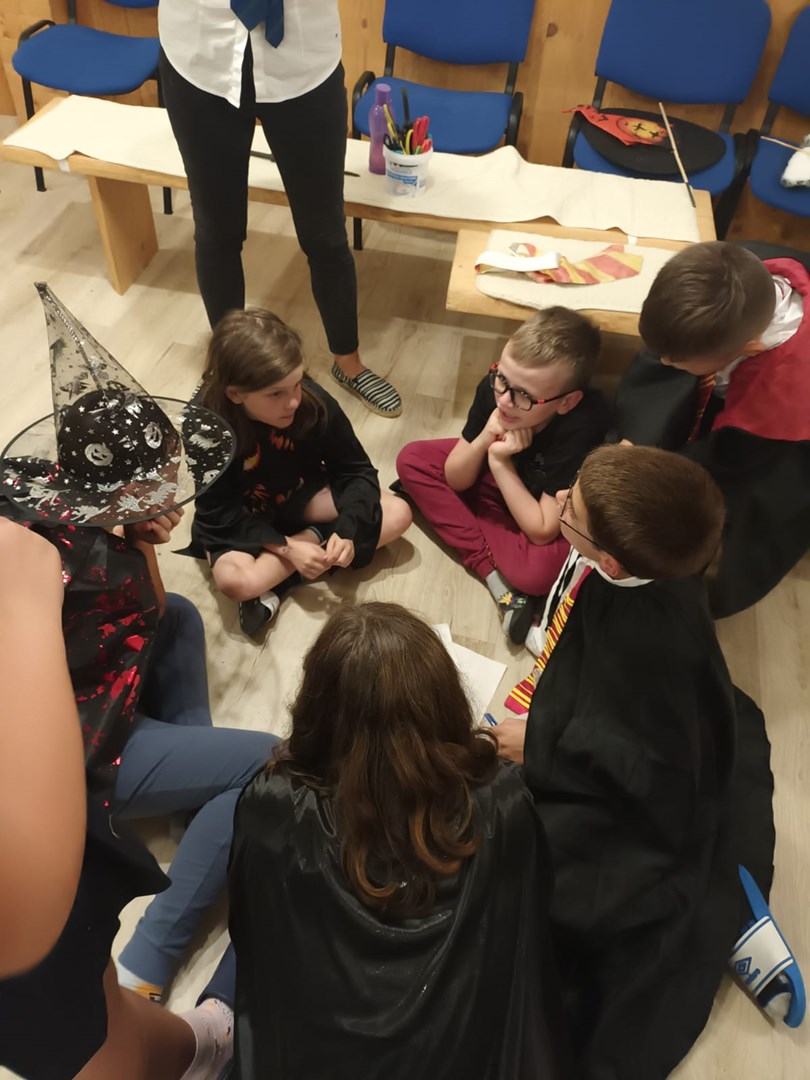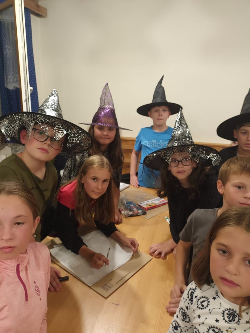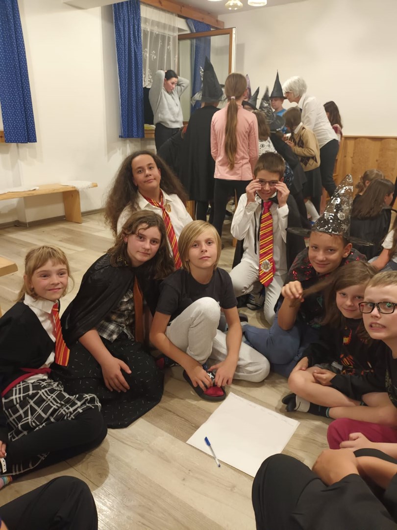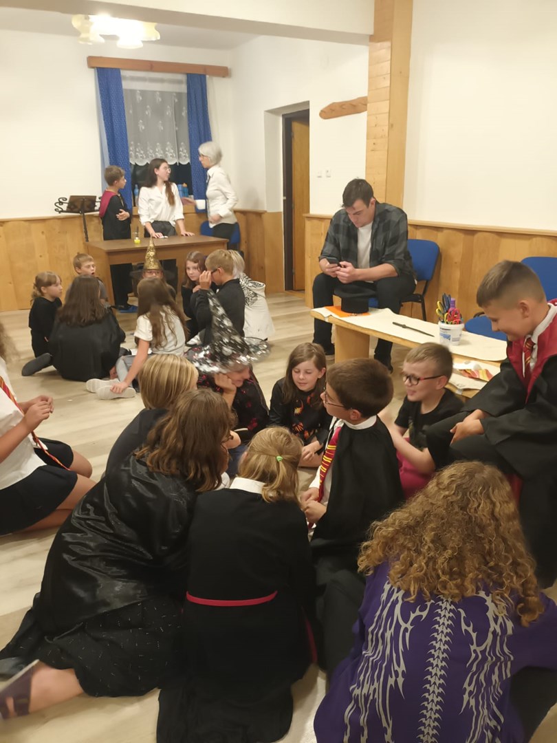 Škola v přírodě pokračuje dále a my jsme všichni plní zážitků. Večer plný čar a kouzel? S “FOKUSÁKY” není žádný problém . V podvečer začaly velké přípravy, všichni jsme si oblékli kostýmy a zkrášlovali své obličeje. Tajemství kouzelného klobouku nás napínalo až do konce úterního dne. Havraspár, Zmijozel, Mrzimor nebo Nebelvír?? Na nic jiného jsme nemysleli. Středeční pomyslnou třešničkou na dortu byla stezka důvěry. Všichni jsme si vyzkoušeli, jaké to je, když má člověk zrakovou vadu a musí plně důvěřovat svému průvodci. Zakončení stezky důvěry bylo u ohniště, kde jsme si vyprávěli podivuhodné příběhy. A máme tady čtvrtek. Dnešní Bradavický expres vyjel směrem do Karolinky, kde jsme si prohlédli v obchůdku výrobky ze skla. Nezapomněli jsme ani na kamaráda Dobbyho a postavili jsme mu v začarovaném lese chýše, ve které se nakonec rozhodl bydlet - nám zůstalo utajeno. Míchání lektvarů? Obchodování? Pěstování Mandragory? Tak to pro nás není žádný problém. Každý den si totiž užíváme spoustu zábavných sportovních her.