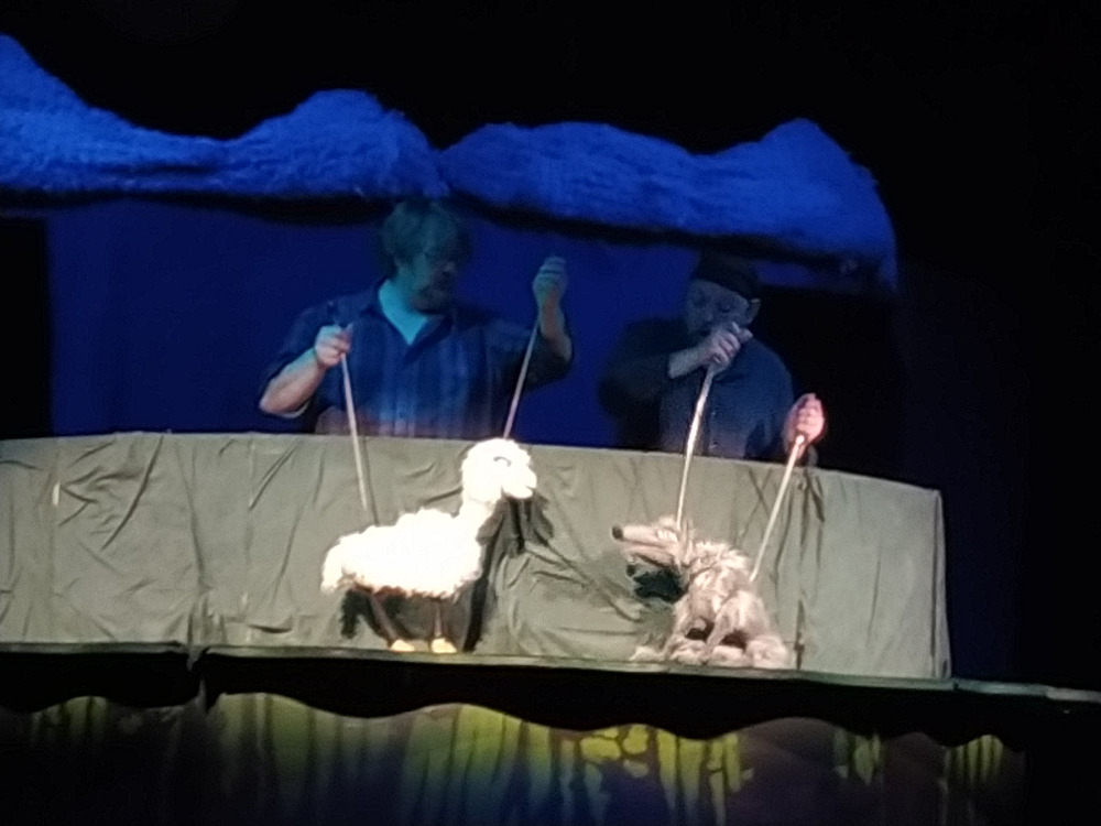 beránka a jeho ovečky, na něž si brousí zuby trojice vlků. Samozřejmě marně!