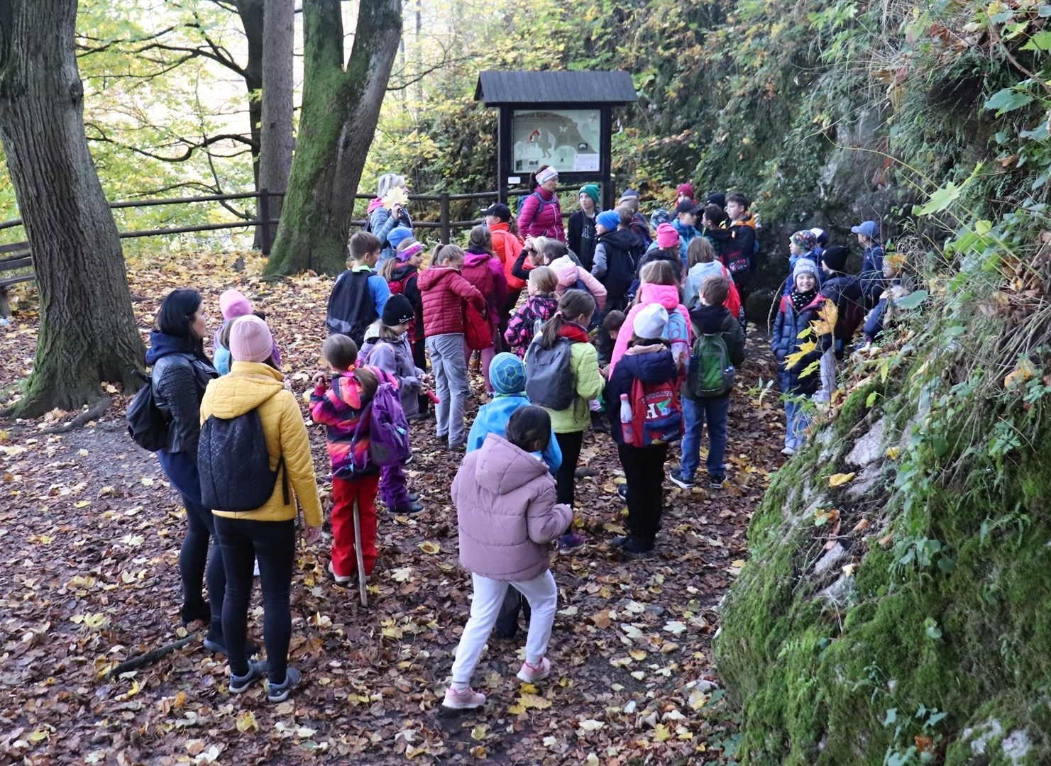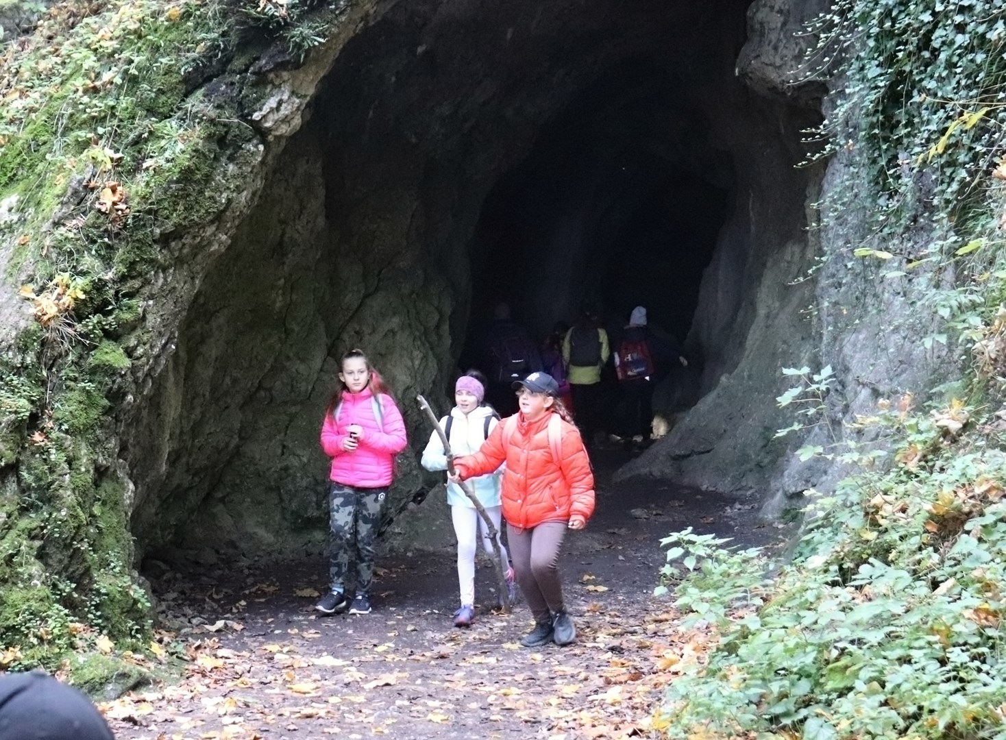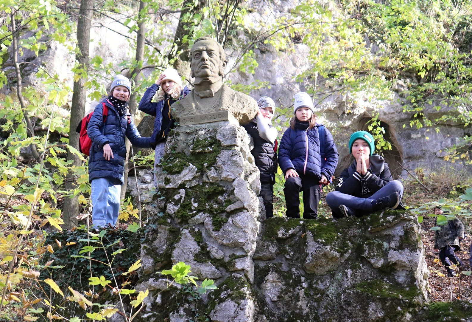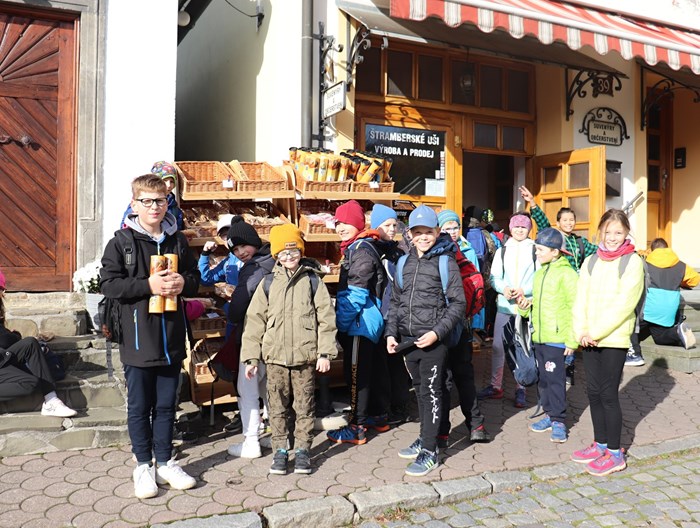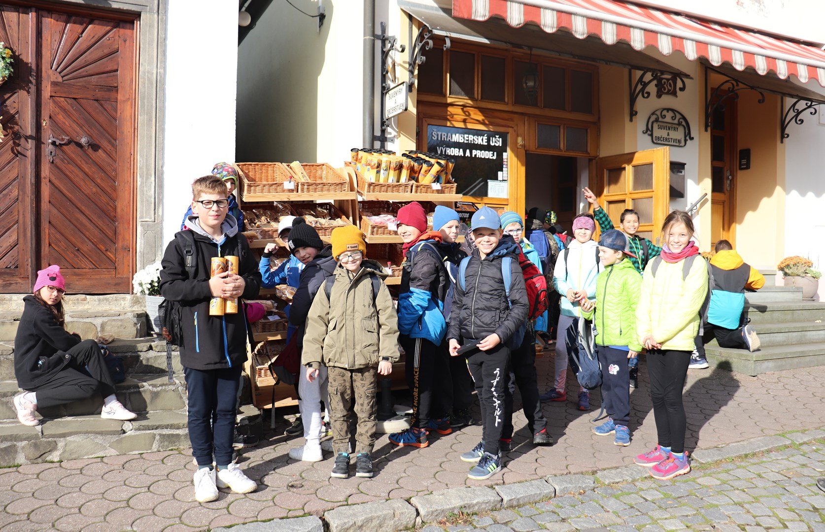Exkurze poté pokračovala ve Štramberku. Zde si žáci prohlédli jeskyni Šipku, roubené domečky, historickou část města s překrásným náměstím a výhledem na Trúbu, připomněli si i těžbu vápence v nedalekém lomu Kotouč a ochutnali štramberskou specialitu – uši.