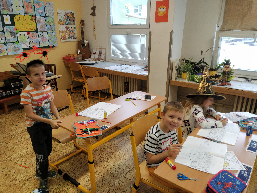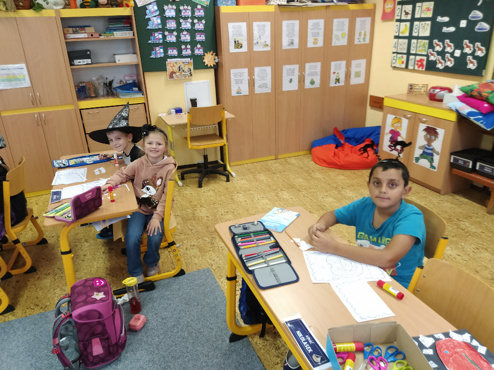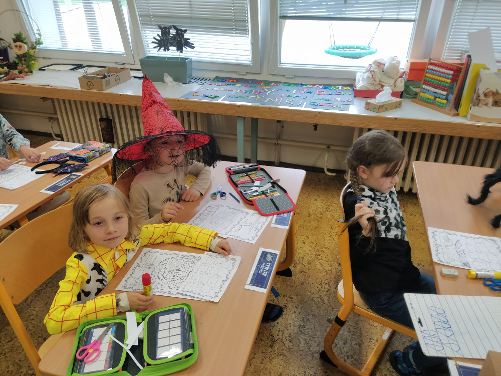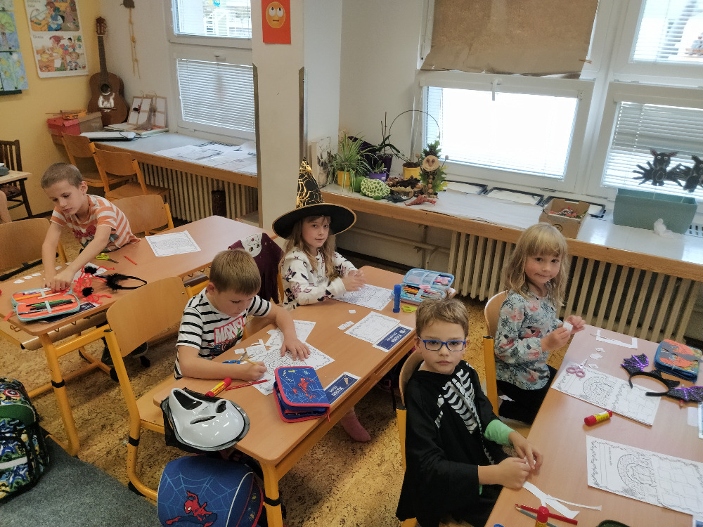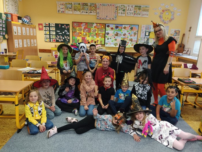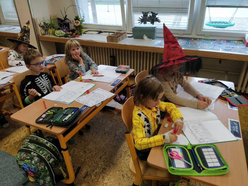 V úterý 31.10.2023 si prvňáčci užili prima halloweenské dopoledne. Do školy nepřišli upravení kluci a naparáděné holčičky, dokonce ani paní učitelka s paní asistentkou, ale do lavic zasedla malá strašidýlka - čarodějnice, kostlivci, upíři… . Během vyučování jsme se seznámili s tradicí tohoto anglosaského svátku, ale nezapomnělo se ani na Dušičky. Nechyběly zajímavé úkoly, básnička a den jsme zakončili tanečkem.