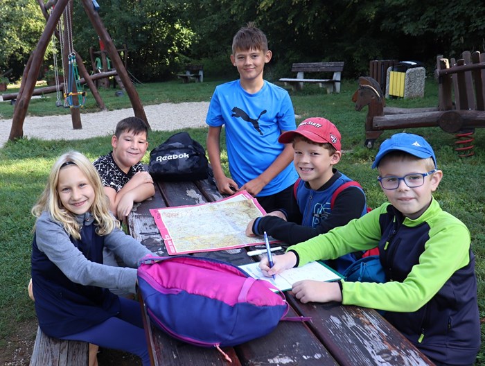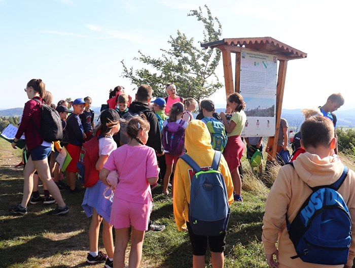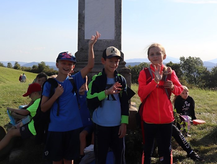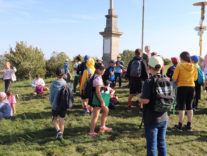 V terénu následovala hlavní část vycházky, a to samotná orientace podle mapy, určování měst podle světových stran, velmi důležitá byla práce s kompasem a buzolou. Z vrcholu kopce jsme pozorovali krajinu, kde se nám naskytl pohled do okolí. Zopakovali jsme si společně důležité pojmy z učiva vlastivědy: obzor, vrchol, úpatí, úbočí, názvy kopců a jiné.