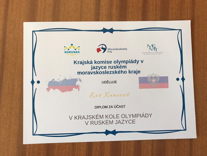 V pátek 25.3. se konalo krajské kolo Konverzační soutěže v ruském jazyce. Naši školu reprezentovala Eva Kuncová (8.B). Eva si zdárně poradila s poslechem, tématem i řešením situace v ruském jazyce. V krajské kole se umístila na 4. místě.
