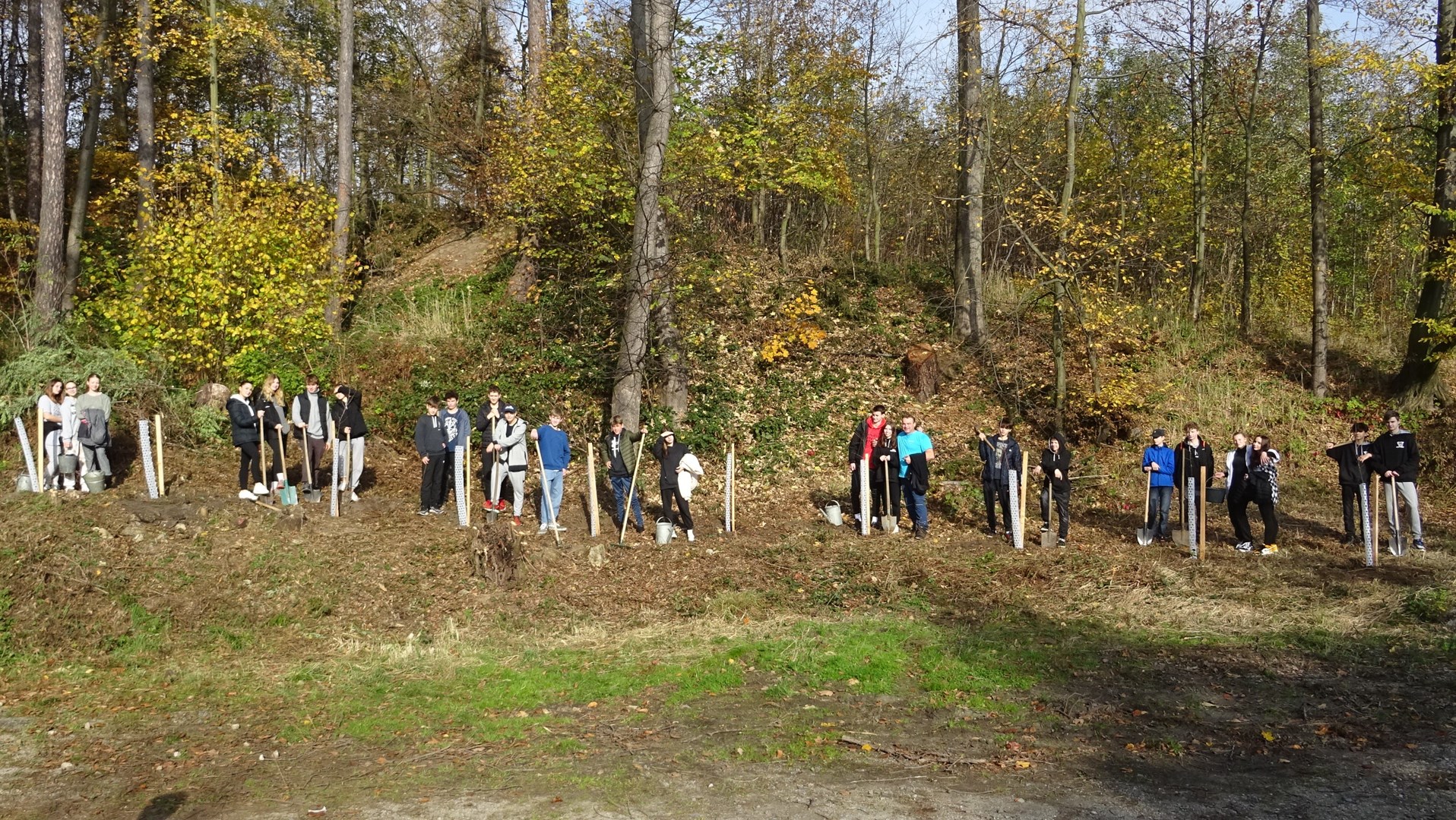 Pracovníci odboru životního prostředí vybrali, připravili a označili místa určená pro výsadbu. Zajistili také dopravu stromků a opěrných kůlů. Vlastními silami jsme přinesli nářadí ze školní zahrady až na místo výsadby u Kamenného divadla na Skalkách. Dostali jsme rady, jak správně postupovat. Naším úkolem bylo vykopat půlmetrové jámy, zatlouct opěrné kůly, usadit rostlinu a následně zasypat a zavlažit. Vodu pro první závlahu jsme nabírali z blízkého pramene.