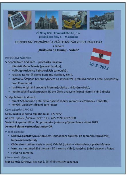 Přihlášení na tento zájezd probíhá zápisem do seznamu přímo ve vyučování nebo v kabinetu č. 68 u paní učitelky Dany Kirthové.