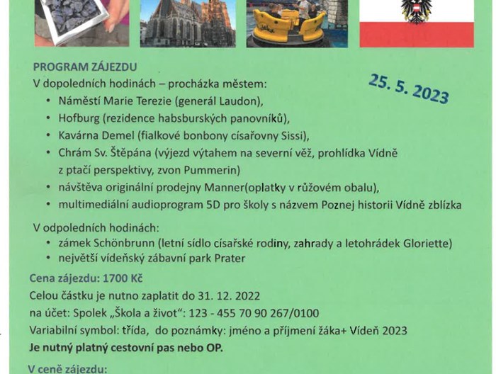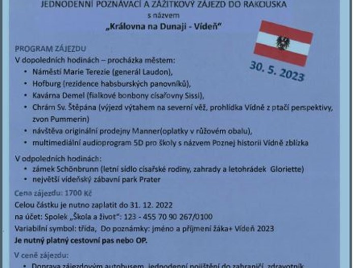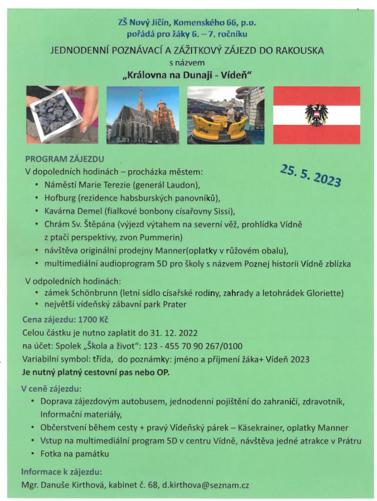 Přihlášení na tento zájezd probíhá zápisem do seznamu přímo ve vyučování nebo v kabinetu č. 68 u paní učitelky Dany Kirthové. Pokud dítě nebude v seznamu, není na zájezd přihlášeno! a případné platby dopředu na uvedený účet budeme vracet zpět.