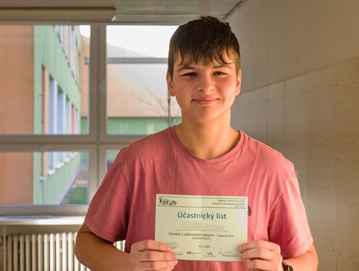 Ve čtvrtek 15. 2. 2024 se ve Středisku volného času Fokus konalo Okresní kolo konverzační soutěže v německém jazyce. Naši školu reprezentovali 4 žáci. V kategorii žáků 7. ročníků obsadil Miroslav Hodslavský ze 7. A třídy krásné 3. místo a Elen Šímová ze 7. B místo šesté.
