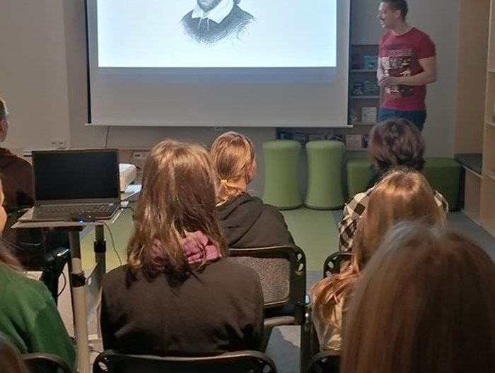 V druhém listopadovém týdnu navštívili žáci 8. ročníků netradiční přednášku o Williamu Shakespearovi v T-klubu Městské knihovny Nového Jičína. Ač byla původně tato beseda určena studentům gymnázií, svou lehkostí a nevšedním pojetím si okamžitě získala naši pozornost.