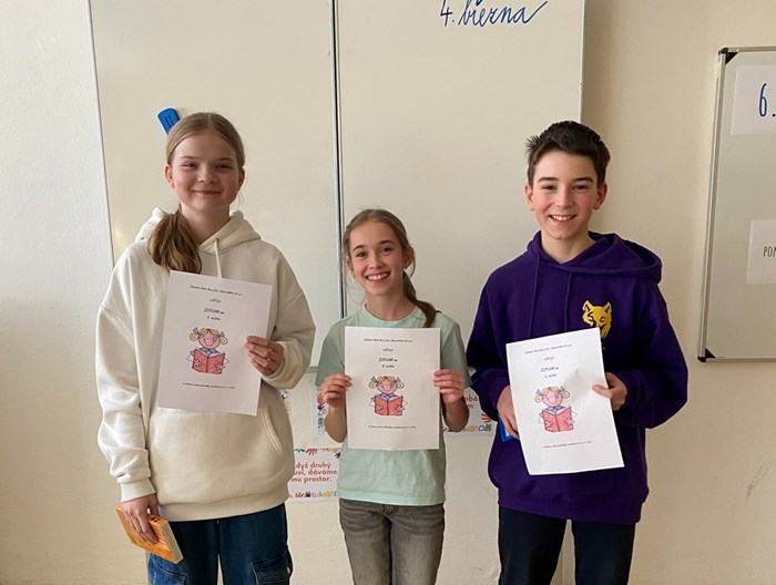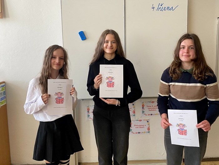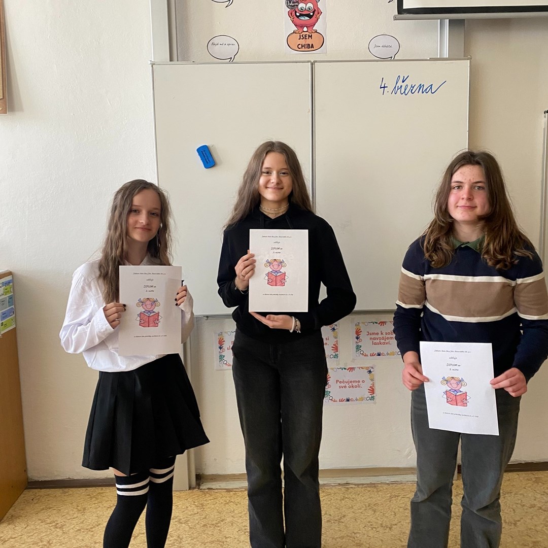 V úterý 4. března se na druhém stupni konala recitační soutěž, které se zúčastnilo celkem šestnáct žáků. V kategorii 6. - 7. ročníků se na prvním místě umístila Valentýna Kusá, druhé místo obsadil Tomáš Knop a krásný bronz získala Hana Tovaryšová. Z 8. a 9. tříd získala 1. místo deváťačka Hedvika Videnková, druhé i třetí místo obsadily žákyně osmé třídy Aneta Valčuhová s Lucií Juříkovou. Umístěným moc gratulujeme a všem zúčastněným děkujeme za příjemně prožité odpoledne.