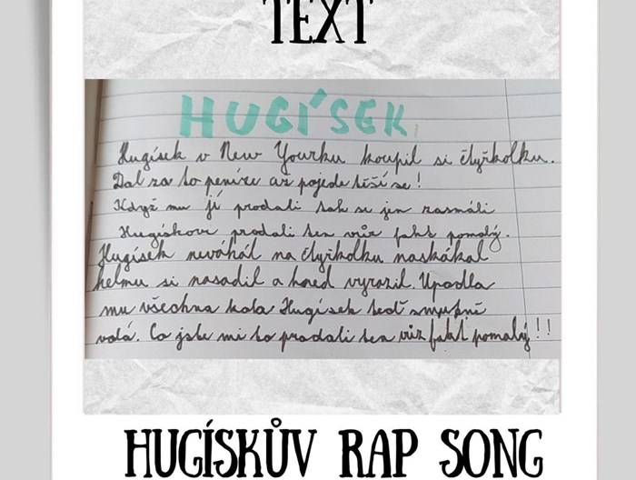 Jak jsme letos rozjeli hudební výchovu v 6. B? Zábavně! Úkolem žáků bylo vytvořit ve skupinách svůj vlastní rapový text. Po dobu jedné vyučovací hodiny šesťáci tvořili své originální texty, a že jim daly pořádně zabrat. Měli možnost vcítit se do umělců, kteří musí skládat písně denně. Nejen, že vznikly velmi originální texty, ale do skládání se přidal i třídní maskot - medvídek mýval Hugo. Hugísek, jak mu žáci s oblibou říkají, je pilným žákem, dokonce má i svůj vlastní sešit, do kterého si píše v hodinách poznámky. Jeho opatrovníci a stvořitelé Míša s Matym k sobě přibrali Elišku s Kristýnkou a složili rap, ve kterém se Hugo ocitl v New Yorku, a tam ztratil čtyřkolku. Sami se můžete podívat, jak se jim text povedl!