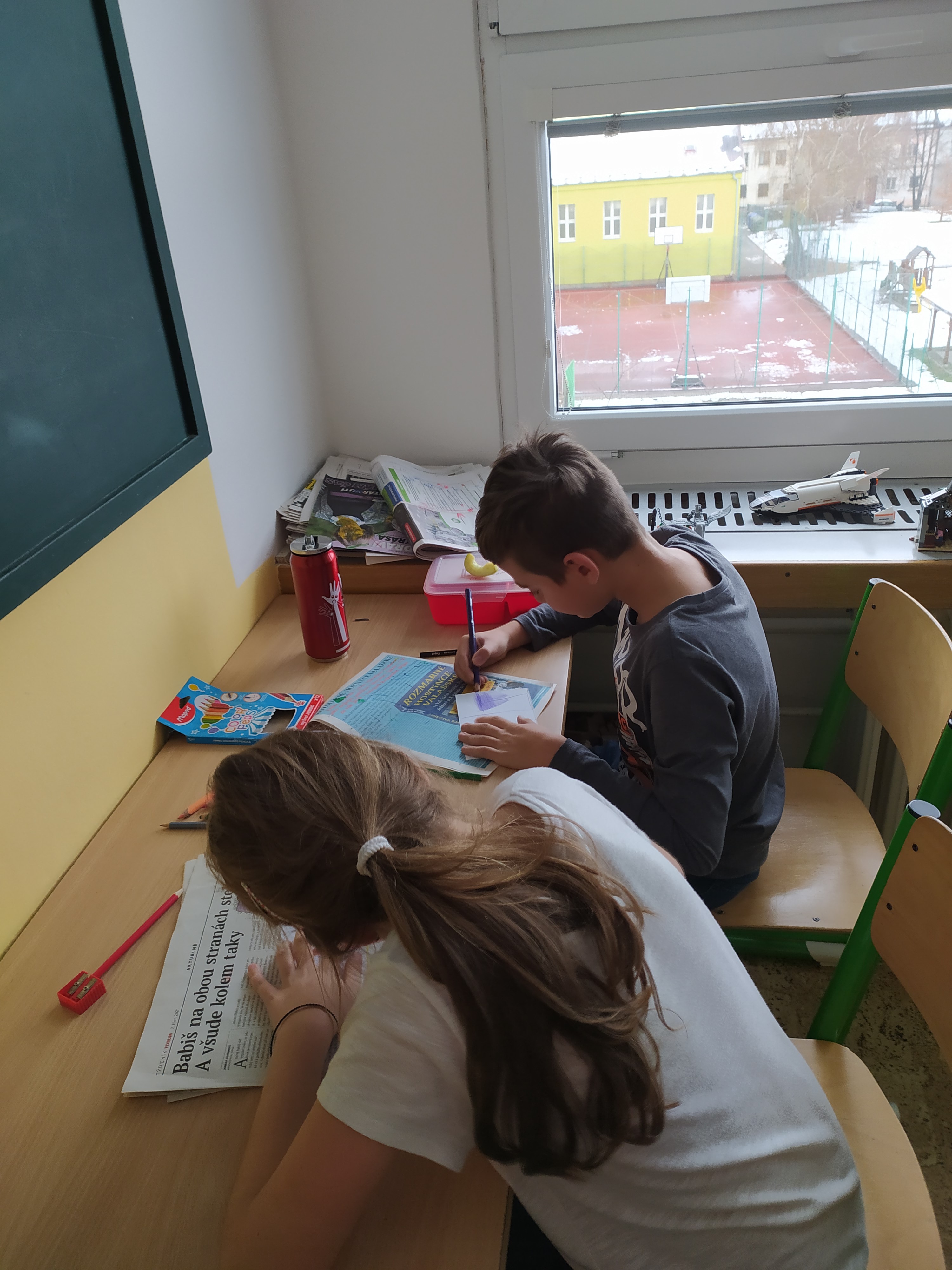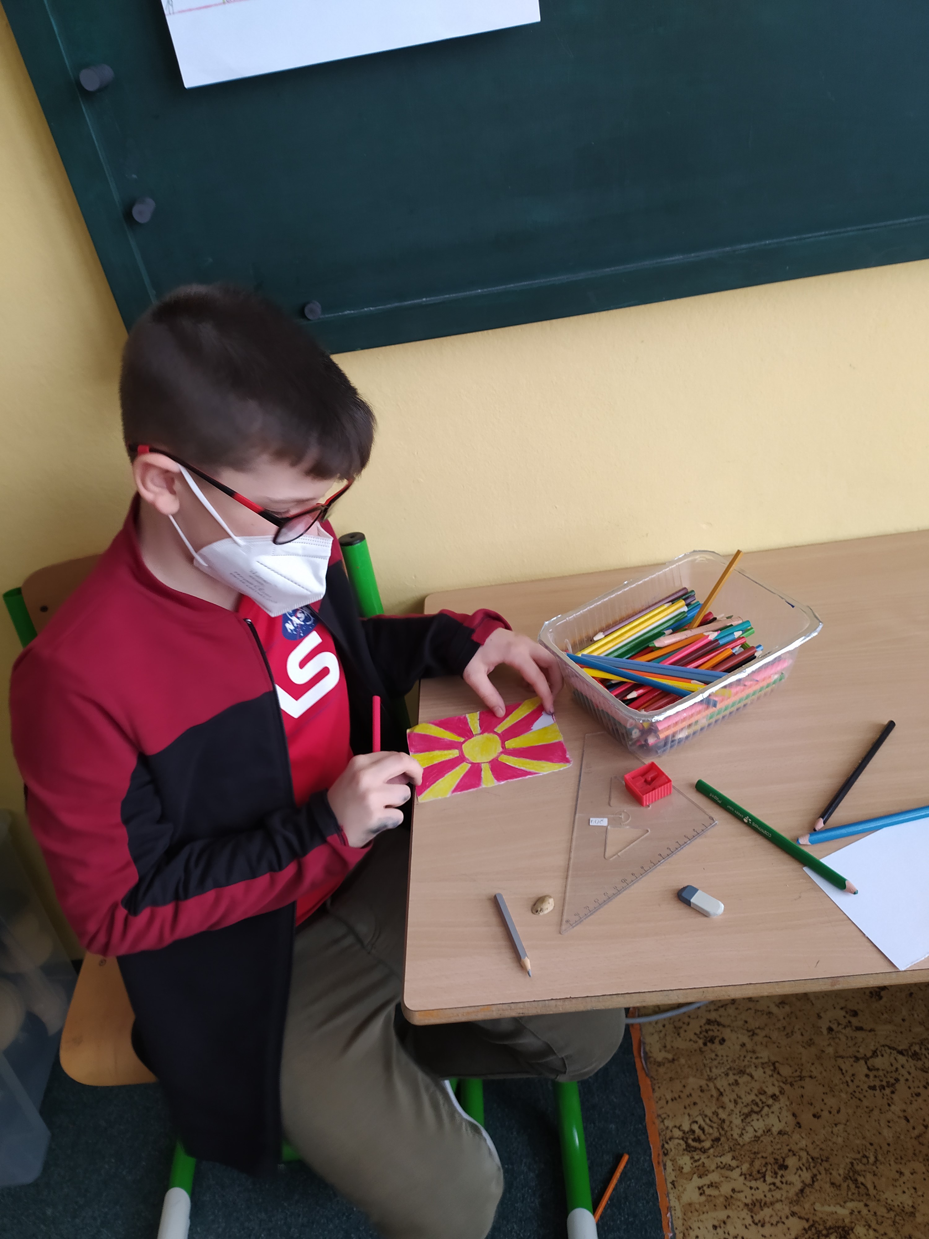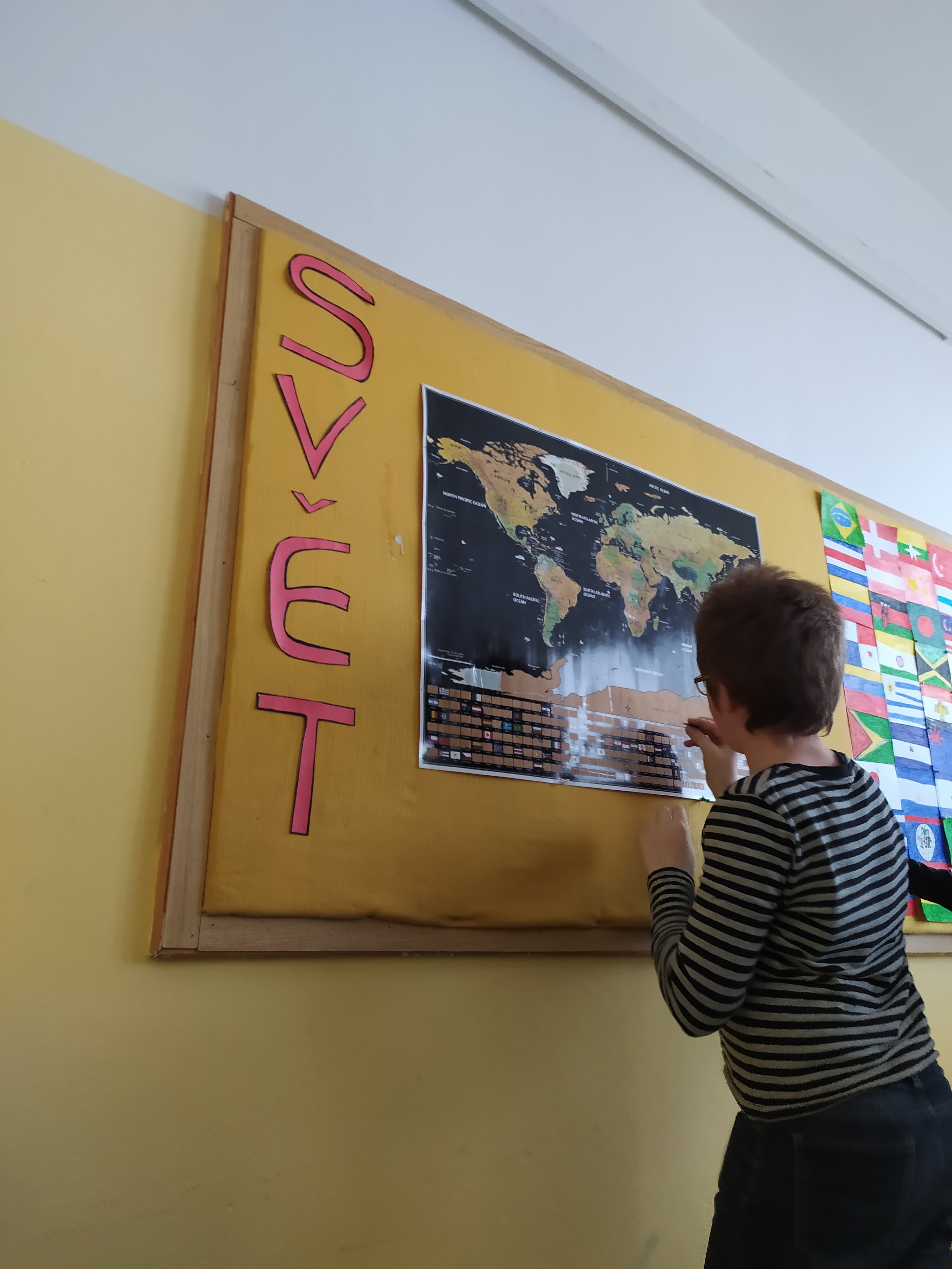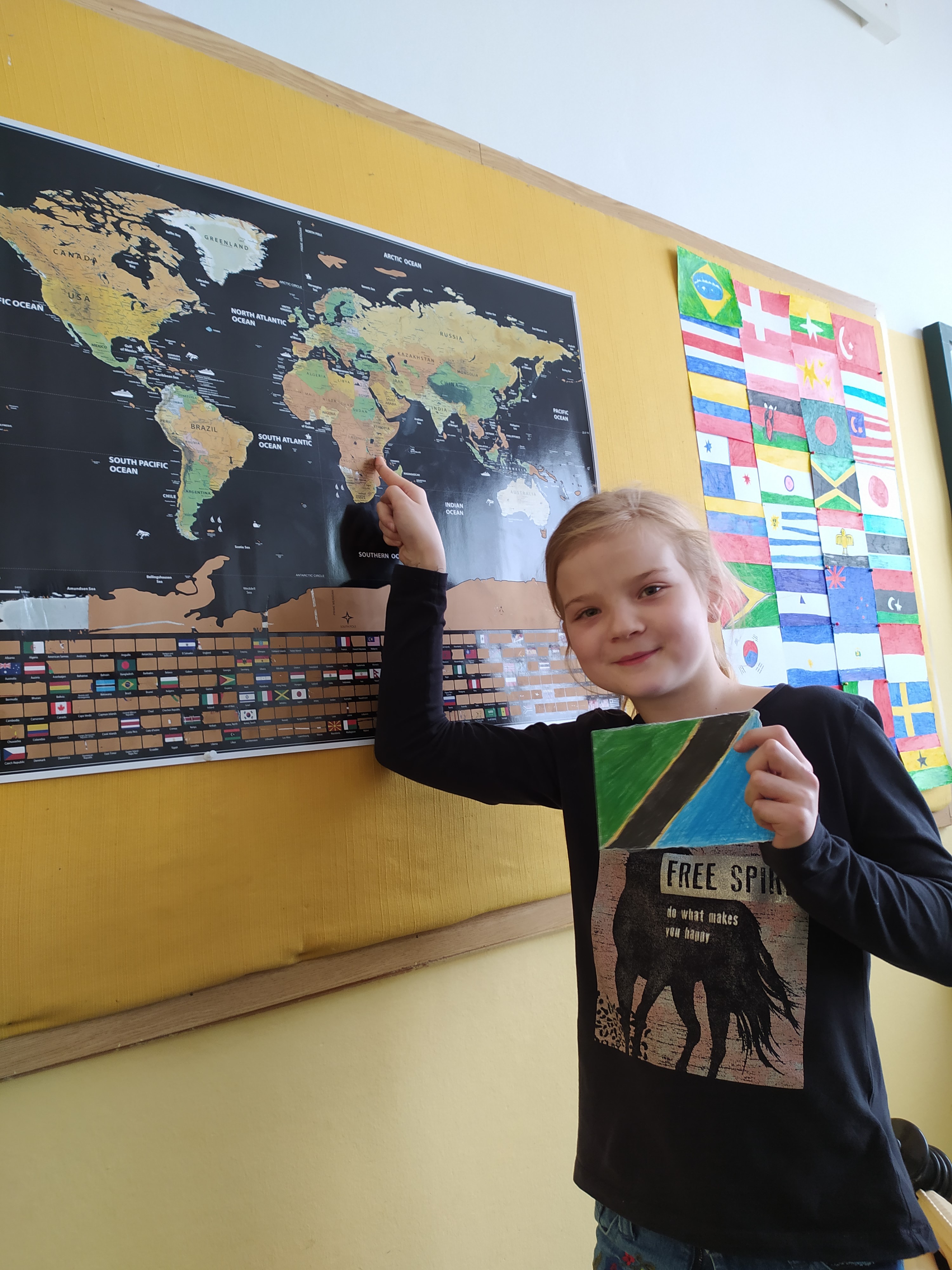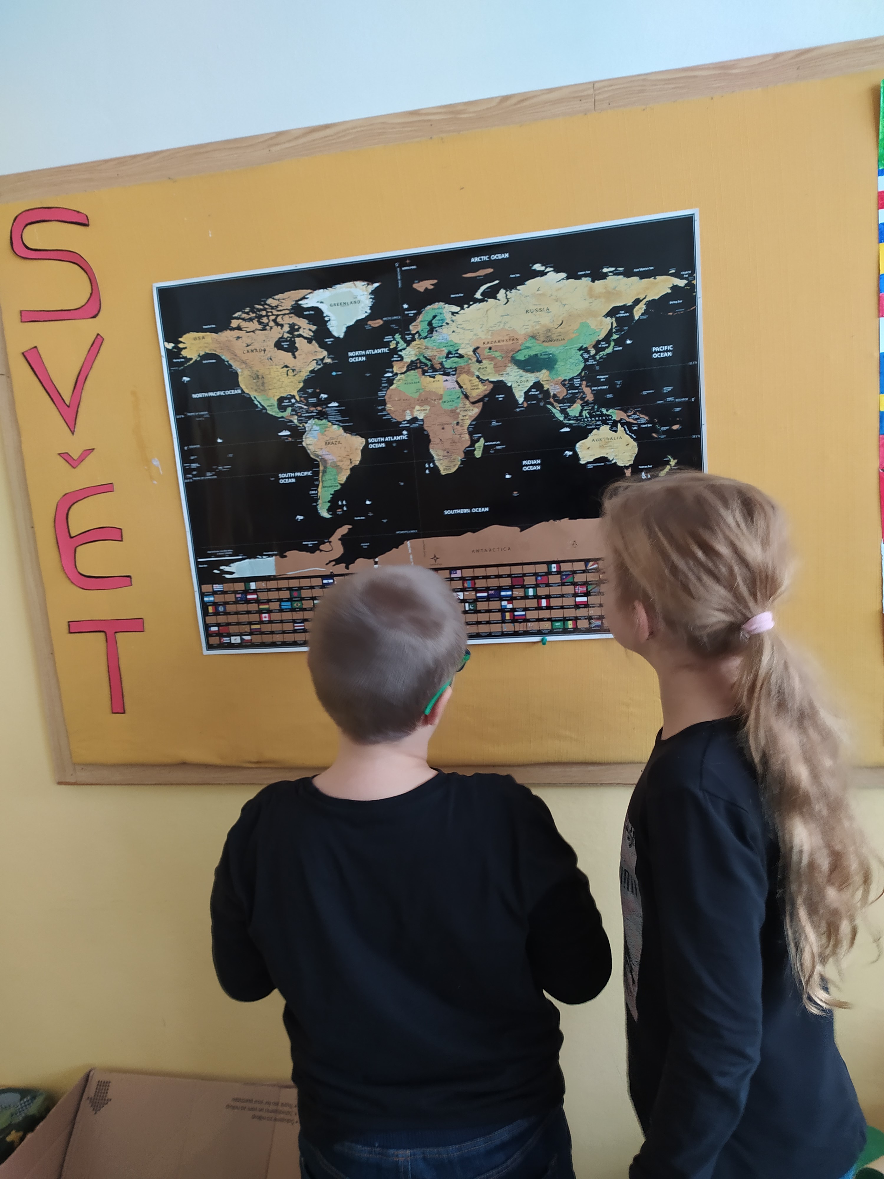 Šesté oddělení se také vydalo na poznávání světa. Povídali si, kde se jaká země nachází a jakou má vlajku. Žáci si vlajky nakreslili a poté vyškrábli na netradiční škrabací mapě světa.