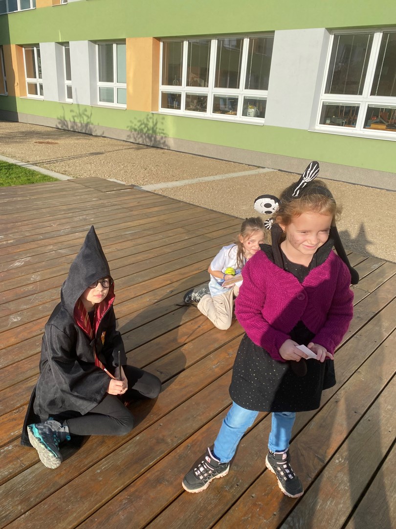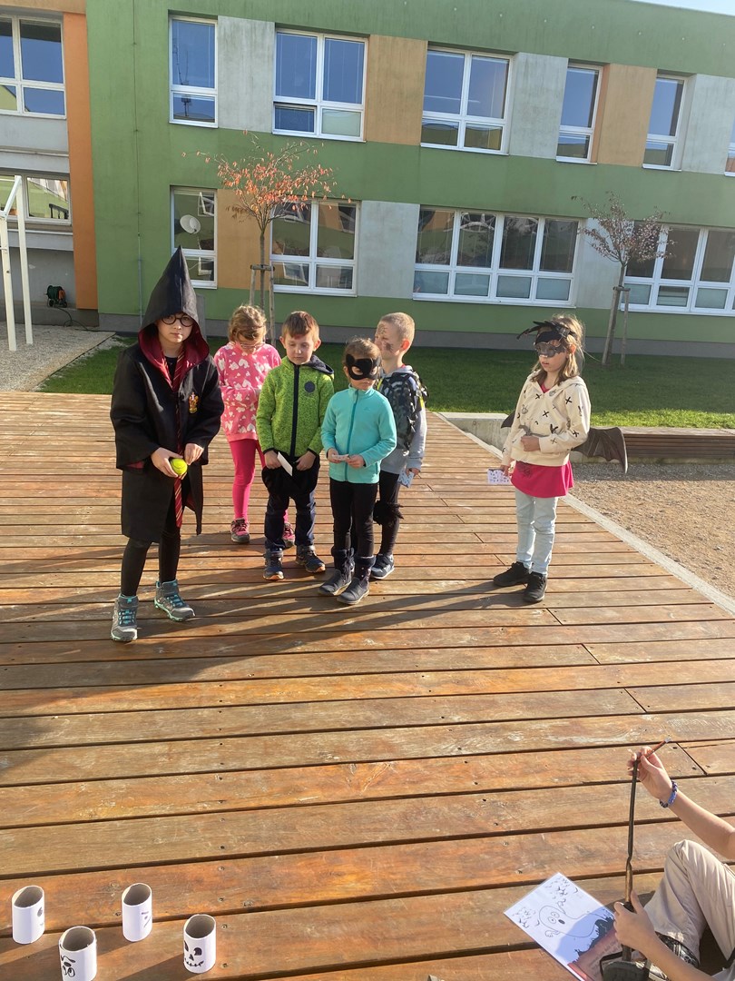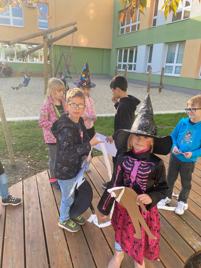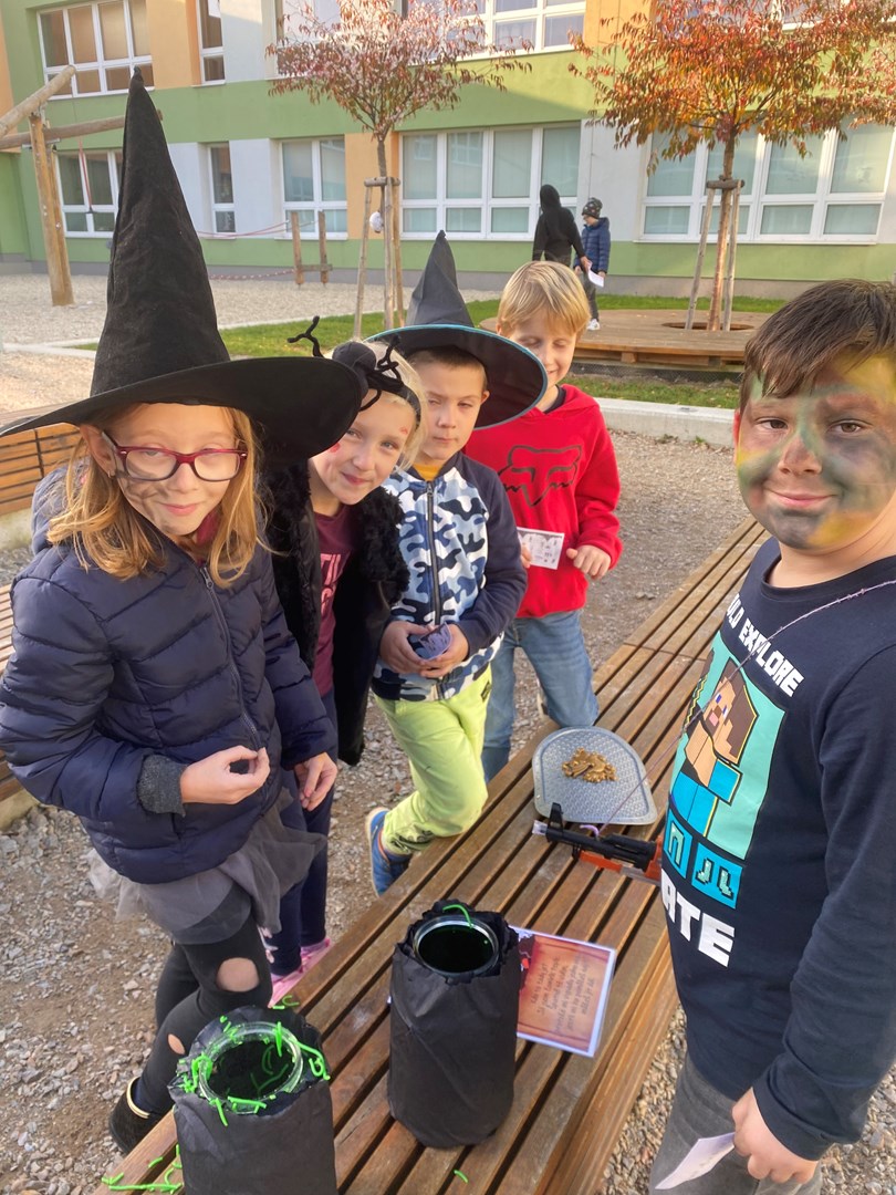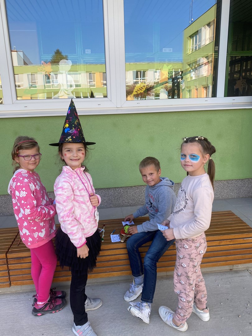 Poslední říjnový den se prvňáčci a žáci 3.B proměnili v čaroděje, duchy, pavouky a strašidla. Pro nadpřirozené bytosti bylo připraveno několik stanovišť, kde plnily všemožné úkoly. U vlkodlaka Vény se učily výt na měsíc, zombíkovi Pepovi hledaly ztracené oko, prolezly pavučinou od pavouka Ferdy a kostlivci Jeronýmovi poskládaly bratra Jaromíra.