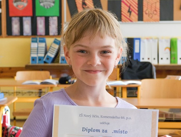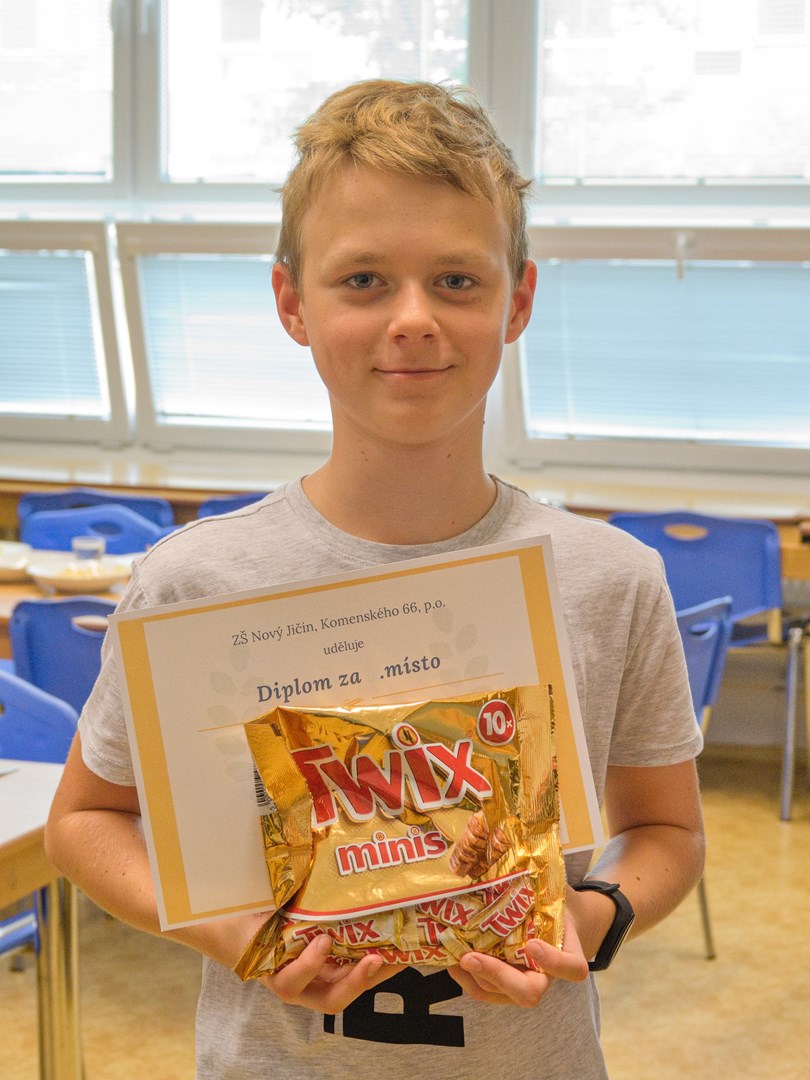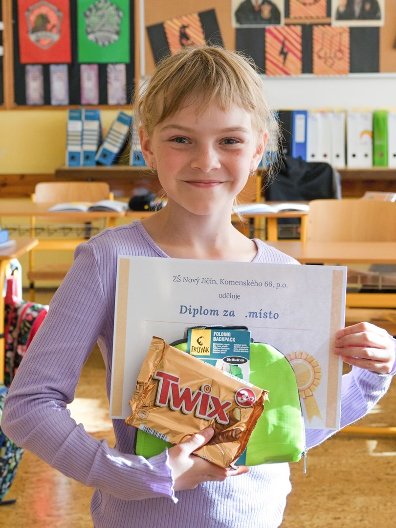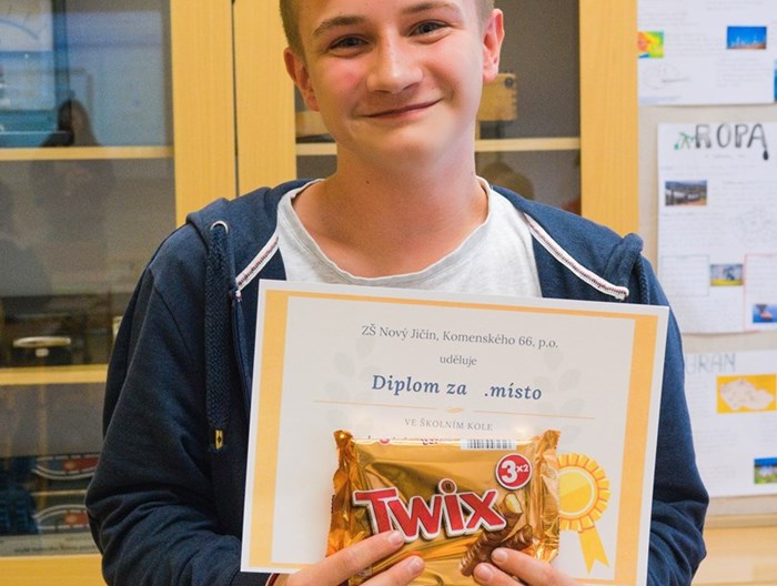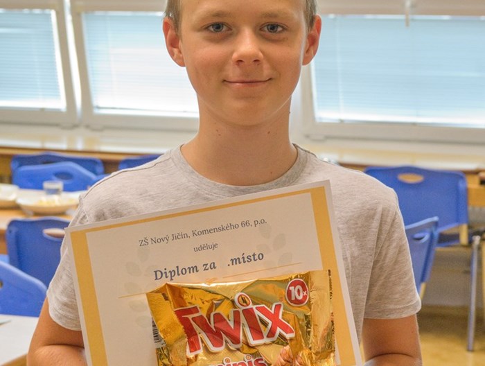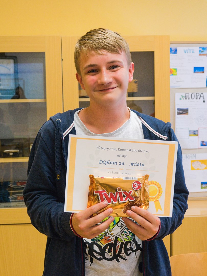 Letos na naší škole soutěžilo 18 dětí v kategorii 3.- 5. ročník a 22 dětí v kategorii 6.-9. ročník. V kategorii mladších dětí získal první místo Ondřej Bača. Na druhé místo dosáhli společně Beáta Hrušková a Tony Kočí. V kategorii starších dětí zvítězil Matyáš Máček, který se také kvalifikoval do krajského kola. Držíme palce! Stříbrný post obsadil Lukáš Rusňák a bronz získal Daniel Paloušek.