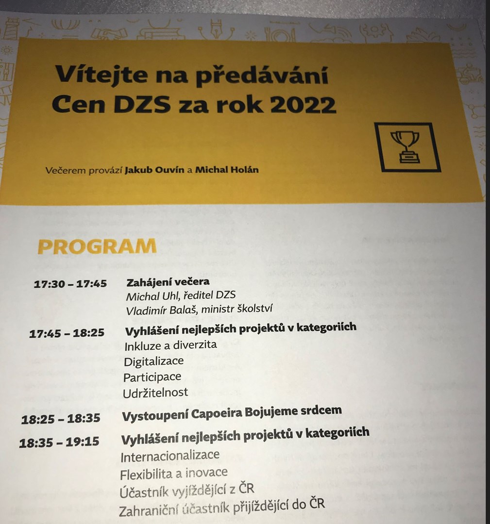 Velmi nás potěšilo, že si našeho projektu Written in Stone všiml i Dům zahraniční spolupráce. Velkým překvapením však bylo pozvání zástupců školy do Slovanského domu v Praze. Zde se ve čtvrtek 23.3. konalo slavnostní předávání cen Domu zahraniční spolupráce za rok 2022. Slavnostní akce probíhala za účasti ministra školství, pana profesora Vladimíra Balaše, a projekt naší školy byl nominován mezi pět nejlepších projektů v oblasti participace.