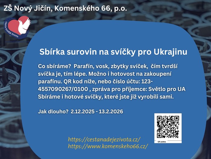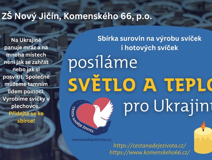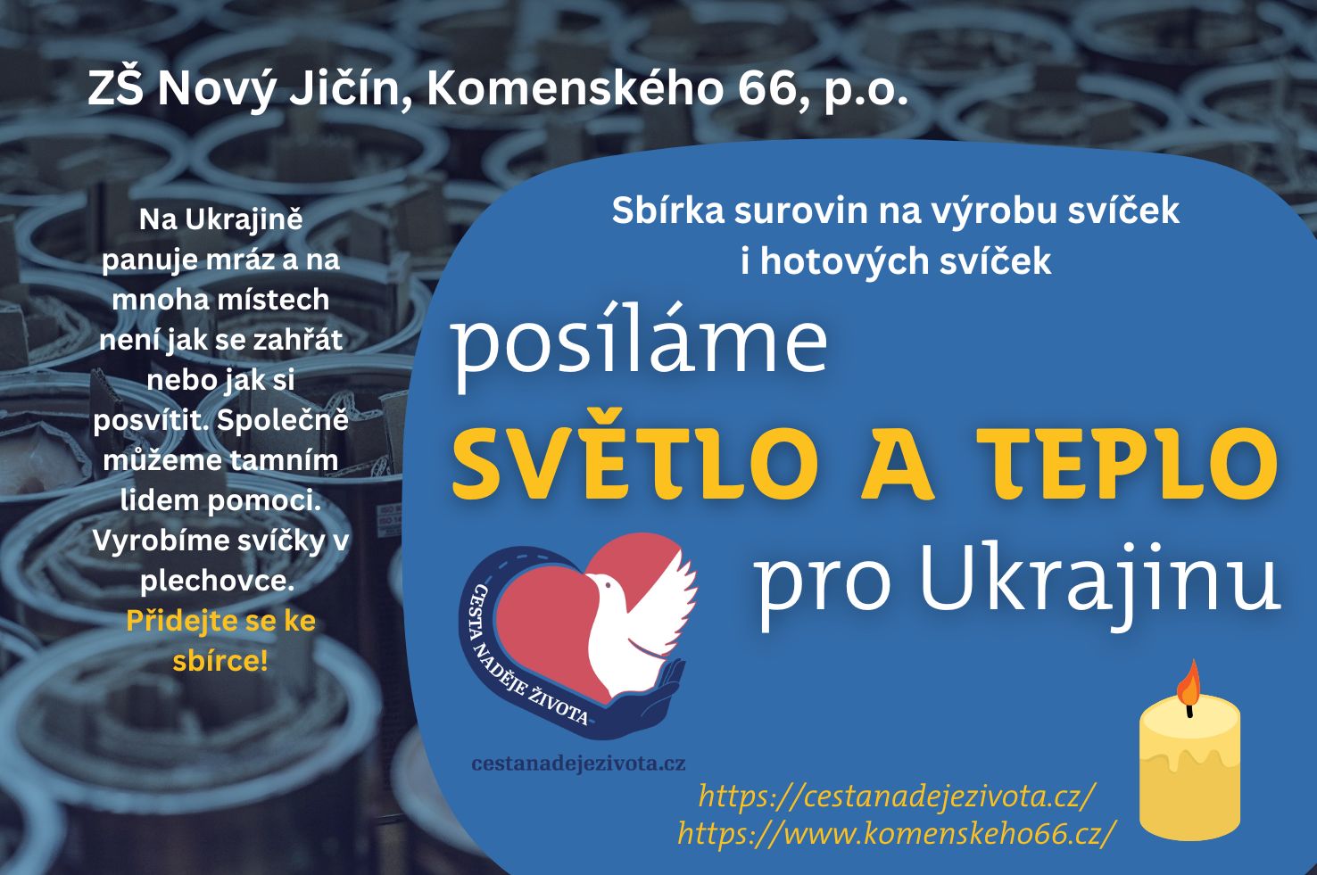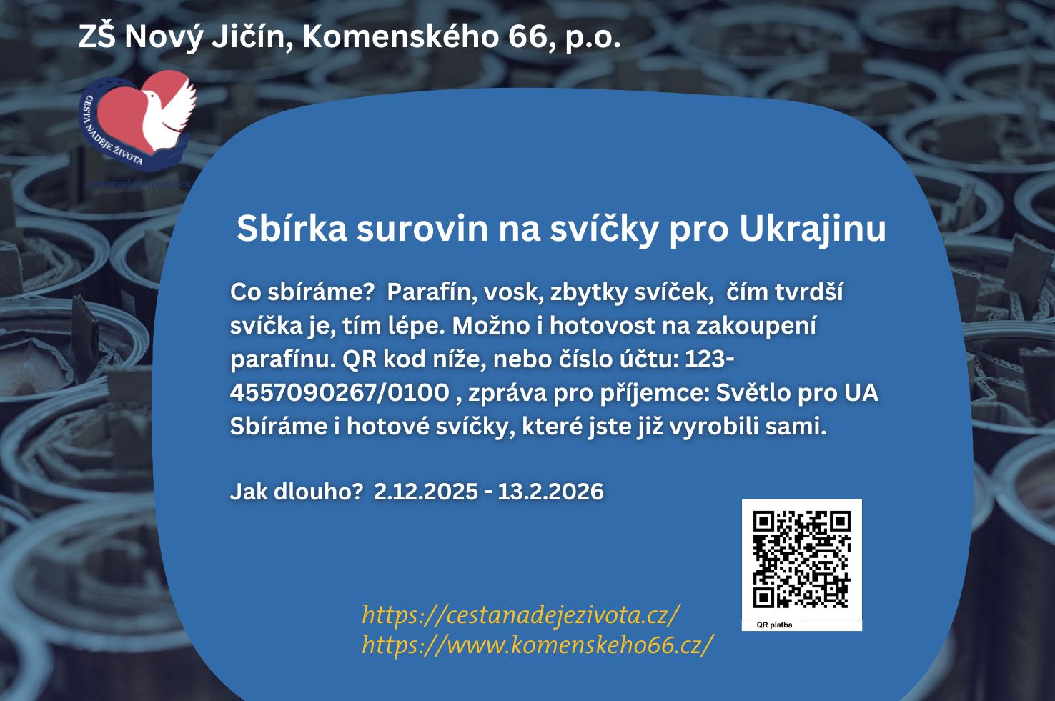 Spolu se spuštěním našeho Vánočního jarmarku 2.12.25 zahajujeme i školní dobročinnou sbírku „Světlo a teplo pro Ukrajinu“.
